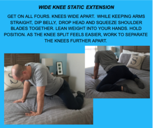 HOW: GET ON ALL FOURS. KNEES WIDE APART. WHILE KEEPING ARMS STRAIGHT, DIP BELLY, DROP HEAD AND SQUEEZE SHOULDER BLADES TOGETHER. LEAN WEIGHT INTO YOUR HANDS. HOLD POSITION. AS THE KNEE SPLIT FEELS EASIER, WORK TO SEPARATE THE KNEES FURTHER APART.