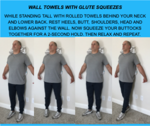 HOW: STAND WITH HEELS, BUTT, SHOULDERS, HEAD AND ELBOWS AGAINST WALL. HOLD POSITION.