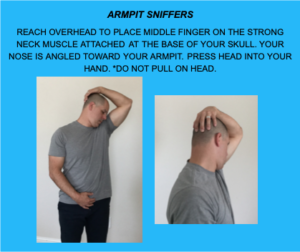 HOW: REACH OVERHEAD TO PLACE MIDDLE FINGER ON THE STRONG NECK MUSCLE ATTACHED AT THE BASE OF YOUR SKULL. YOUR NOSE IS ANGLED TOWARD YOUR ARMPIT. PRESS HEAD INTO YOUR HAND. *DO NOT PULL ON HEAD.