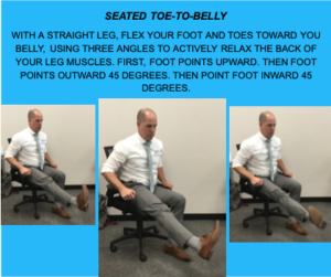 HOW: WITH A STRAIGHT LEG, FLEX YOUR FOOT AND TOES TOWARD YOU BELLY, USING THREE ANGLES TO ACTIVELY RELAX THE BACK OF YOUR LEG MUSCLES. FIRST, FOOT POINTS UPWARD. THEN FOOT POINTS OUTWARD 45 DEGREES. THEN POINT FOOT INWARD 45 DEGREES.
