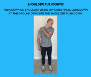 HOW: PUSH DOWN ON SHOULDER USING OPPOSITE HAND. LOOK DOWN AT THE GROUND OPPOSITE THE SHOULDER PUSH DOWN.