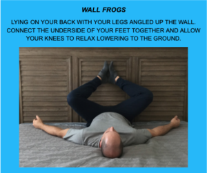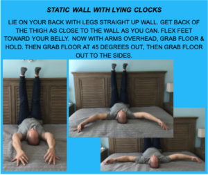 HOW: LIE ON YOUR BACK WITH LEGS STRAIGHT UP WALL. GET BACK OF THE THIGH AS CLOSE TO THE WALL AS YOU CAN. FLEX FEET TOWARD YOUR BELLY. NOW WITH ARMS OVERHEAD, GRAB FLOOR & HOLD. THEN GRAB FLOOR AT 45 DEGREES OUT, THEN GRAB FLOOR OUT TO THE SIDES.