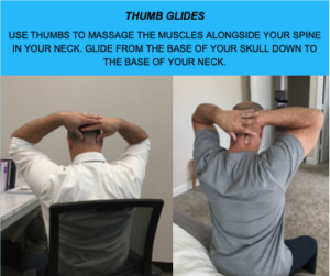 HOW: USE THUMBS TO MASSAGE THE MUSCLES ALONGSIDE YOUR SPINE IN YOUR NECK. GLIDE FROM THE BASE OF YOUR SKULL DOWN TO THE BASE OF YOUR NECK.