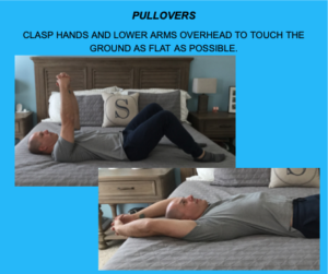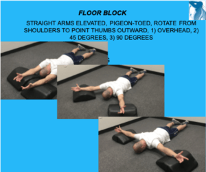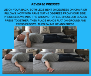 HOW: LIE ON YOUR BACK, BOTH LEGS BENT 90 DEGREES ON CHAIR OR PILLOWS. NOW WITH ARMS OUT 45 DEGREES FROM YOUR SIDE, PRESS ELBOWS INTO GROUND TO FEEL SHOULDER BLADES PRESS TOGETHER. THEN PLACE HANDS FLAT ON GROUND AND PRESS ELBOWS. THEN PALMS UP AND PRESS.