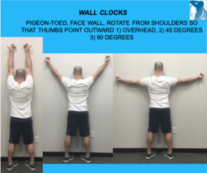 HOW: PIGEON-TOE FEET. STRAIGHT ARMS OVERHEAD WITH, PALMS FACING BEHIND, THUMBS TURNED TO POINT AS FAR OUTWARD TO THE SIDES AS POSSIBLE. HOLD POSITION. THEN MOVE ARMS TO 45 DEGREES, THEN AT 90 DEGREES STRAIGHT OUT FROM THE BODY.
