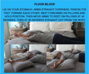 HOW TO: LIE ON YOUR STOMACH, ARMS STRAIGHT OVERHEAD. PIGEON-TOE FEET TOWARD EACH OTHER. REST FOREARMS ON PILLOWS AND HOLD POSITION. THEN MOVE ARMS TO REST ON PILLOWS AT 45 DEGREES, THEN AT 90 DEGREES STRAIGHT OUT FROM THE BODY.