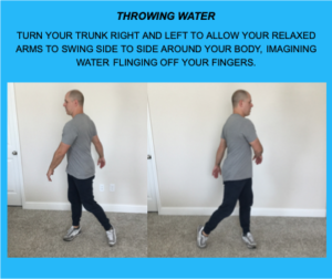 HOW: TURN YOUR TRUNK RIGHT AND LEFT TO ALLOW YOUR RELAXED ARMS TO SWING SIDE TO SIDE AROUND YOUR BODY, IMAGINING WATER FLINGING OFF YOUR FINGERS.